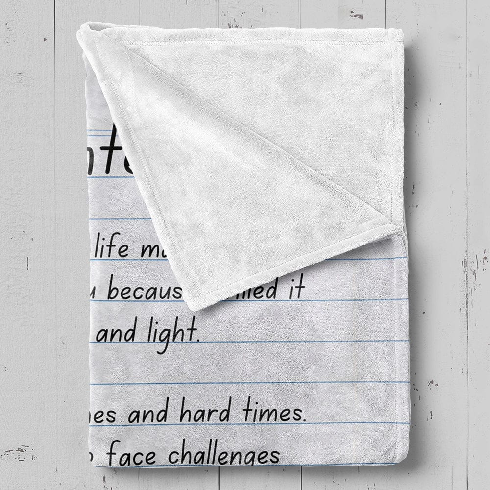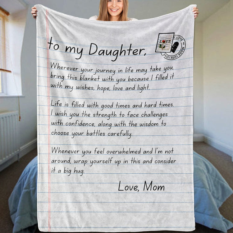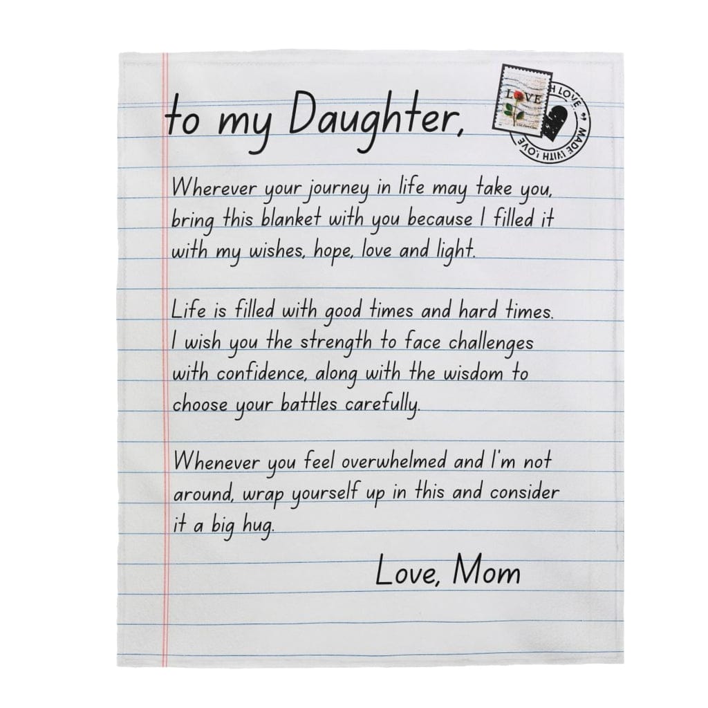 This soft fleece blanket is designed as a thoughtful gift from a mother to her daughter. It combines comfort with a meaningful printed message, making it a keepsake she can use at home or while traveling.