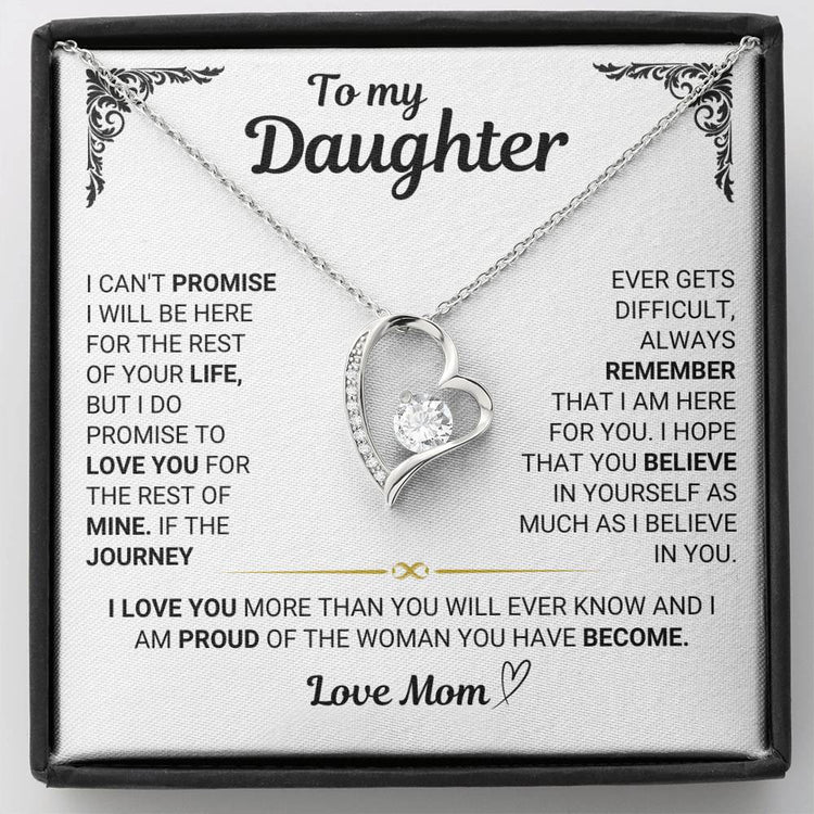 I CAN'T PROMISE I WILL BE HERE FOR THE REST OF YOUR LIFE, BUT I DO PROMISE TO LOVE YOU FOR THE REST OF MINE. IF THE JOURNEY EVER GETS DIFFICULT, ALWAYS REMEMBER THAT I AM HERE FOR YOU. I HOPE THAT YOU BELIEVE IN YOURSELF AS MUCH AS I BELIEVE IN YOU. I LOVE YOU MORE THAN YOU WILL EVER KNOW AND I AM PROUD OF THE WOMAN YOU HAVE BECOME. LOVE, MOM