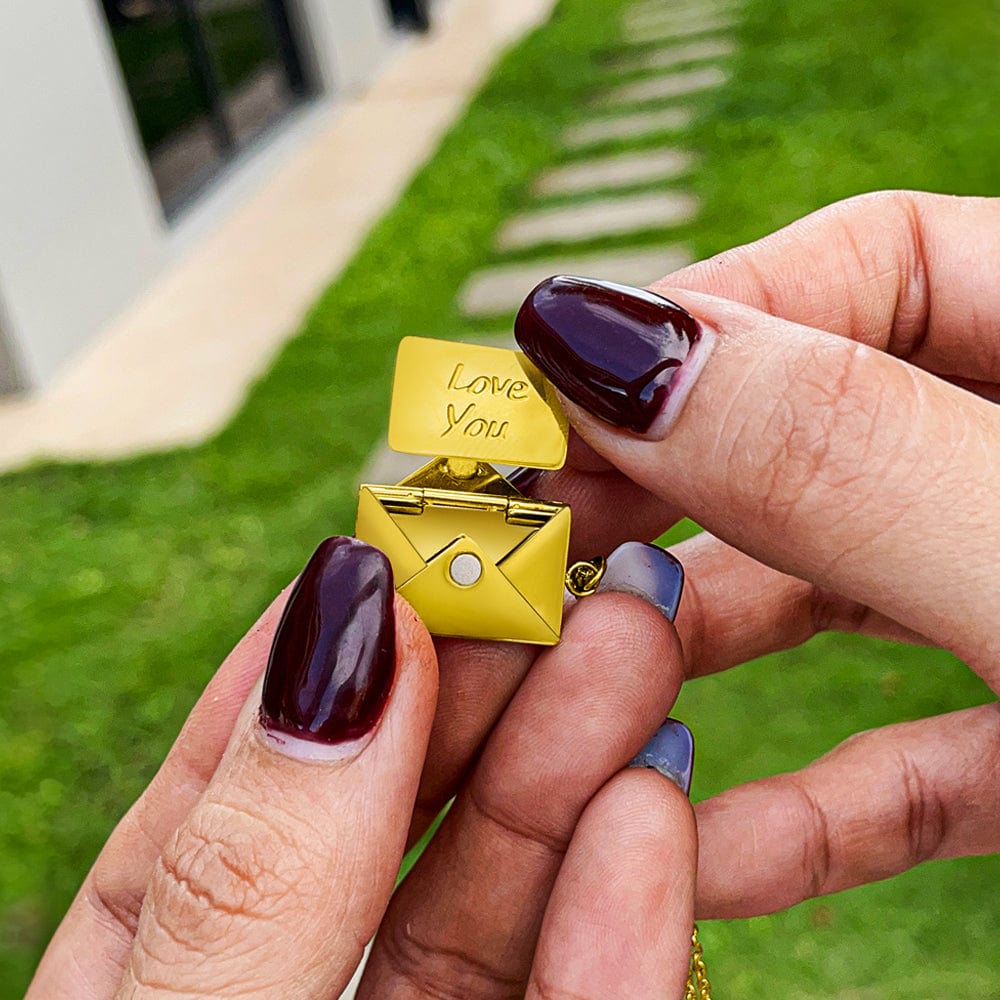 The necklace features an envelope-inspired design with a small engraved tablet inside, paired with a printed message card. Together, they create a keepsake that feels personal and sincere without being overstated.